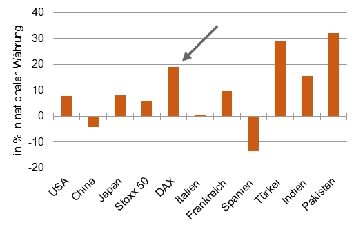 In Deutschland sind die Aktienkurse seit Anfang Januar per Saldo um insgesamt 19 % gestiegen. In der Türkei waren es 29 %, in Ägypten 42,5 %, in Pakistan 32,2 % und in Venezuela sogar 150 %. Die Entwicklung in diesen Ländern ist aber nicht unmittelbar vergleichbar mit der in Deutschland. Es handelt sich zumeist um enge Märkte, bei denen schon geringe Bewegungen zu großen Kursausschlägen führen. In der Vergangenheit waren die besten Aktienperformer in der Regel Länder mit relativ kleinen Märkten (die daher auch schwer prognostizierbar sind).