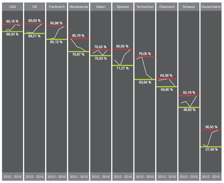 In den Top-10-Märkten ohne Deutschland ist zwar ein merklicher, teils signifikanter Rückgang der Ausfallrisiken festzustellen. So liegt die entsprechende Quote in den Niederlanden, Frankreich, Österreich und Großbritannien nur noch minimal über dem deutschen Niveau, in den USA und der Schweiz gar deutlich darunter. Dennoch bleibt der Anteil von ausländischen Unternehmen, die mit einem überdurchschnittlichen Ausfallrisiko bewertet werden, in der Gesamtbetrachtung der Top 10 klar höher, nicht zuletzt aufgrund ihres relativ hohen Anteils in Spanien und Italien (siehe Abbildung 01).