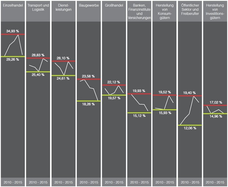 Abbildung 02: Geschäftspartner mit überdurchschnittlichem Ausfallrisiko 2010 - 2015, nach Branchen, Maximum - Minimum