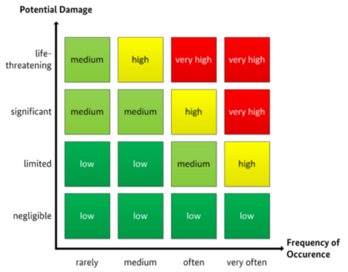 Abb. 01: Risikomatrix nach BSI-Standard 200-3 (Eintrittshäufigkeit vs. Schadensauswirkung). Problematisch ist die Einordnung "selten" + "existenzbedrohend" als "mittel" – ein typisches Muster bei seltenen, aber katastrophalen IT- und Cyberereignissen [Quelle: BSI (2017): BSI-Standard 200-3 - Risk Analysis based on IT-Grundschutz, Bonn 2017].