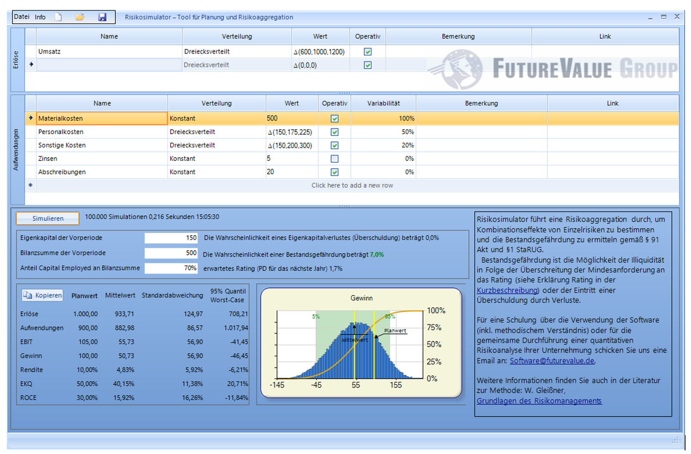 Hierfür stehen in der Zwischenzeit sogar kostenlose Simulationstools speziell für mittelständische Unternehmen zur Verfügung, die einfach und ohne größeren Aufwand in ihrer Anwendung sind. Somit können nun auch kleinere Unternehmen eine Risikoaggregation in wenigen Arbeitsstunden umsetzen. Ein solches Tool ist der beispielsweise der "Risikosimulator" der FutureValue Group AG, kostenlos beziehbar unter http://strategienavigator.net/software. Mit einer vereinfachenden Betrachtung der einjährigen Ergebnisrechnung stellt das Tool einen pragmatischen Einstieg in die simulationsbasierte Risikoaggregation dar.