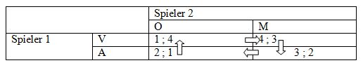 Die vier Strategien (A, V, O, M) und die entsprechenden Bewertungen definieren eine 2x2 Spielmatrix (vgl. Tabelle 1). In jedem Feld der Matrix stehen zwei Ordnungszahlen. Die erste Zahl gilt für Spieler 1, die zweite für Spieler 2. Die Pfeile neben den Bewertungen zeigen die Abweichung des jeweiligen Spielers von der gewählten Strategie. Vertikale Pfeile zeigen Abweichung für den Spieler 2 und horizontale für den Spieler 1.