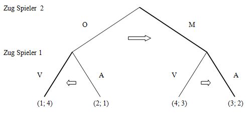 Die Lösung lässt sich aus Abbildung 1 folgendermaßen ableiten. Der Spieler 2 ist zuerst am Zug und entscheidet zwischen Strategien O und M. Dabei muss er bei jeder gewählten Strategie auch die späteren Entscheidungen von Spieler 1 berücksichtigen. Falls Spieler 2 die Strategie O wählt, wird Spieler 1 seine Strategie V wählen, weil in seiner Rangordnung trivialer Weise die Bewertung (1) besser als die Bewertung (2) ist. Dadurch bekommt aber Spieler 2 die schlechteste Auszahlung (4). Falls Spieler 2 die Strategie M wählt, wird Spieler 1 seine Strategie A wählen, da in seiner Rangordnung (3) besser ist als (4). Hier wird Spieler 2 die Auszahlung (2) bekommen. Jetzt vergleicht Spieler 2 die mögliche Auszahlungen in beiden Fällen: (2) ist besser als (4). Somit ist klar, dass Spieler 2 die Strategie M spielen soll, um seinen Nutzen zu maximieren. Der Spieler 1 ist folglich an der Wahl zwischen den Auszahlungen (3) und (4) gebunden. Seine Entscheidung ist klar – er wählt Auszahlung (3) und somit die Strategie A. Diesen Überlegungen entsprechend steht die Lösung des Spieles fest: Die Strategiekombination (A; M) = ("alles Offenlegen"; "mit Sicherheiten") ist das Nash-Gleichgewicht.