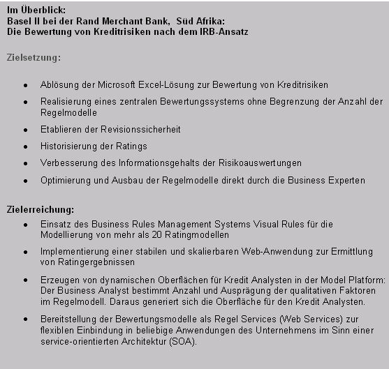 Die Rand Merchant Bank (RMB), ein Tochterunternehmen der First Rand Bank, zählt zu den vier großen Banken in Süd Afrika. Um die Anforderungen nach Basel II zu erfüllen, hat das Unternehmen die Ermittlung von Kreditrisiken nach dem IRB-Ansatz auf eine neue fachliche und technologische Basis gestellt. Die Innovations Softwaretechnologie GmbH aus Immenstaad am Bodensee liefert das Business Rules Management System Visual Rules als technische Grundlage für die Regelmodellierung und die Model Platform zur Durchführung der Ratings.