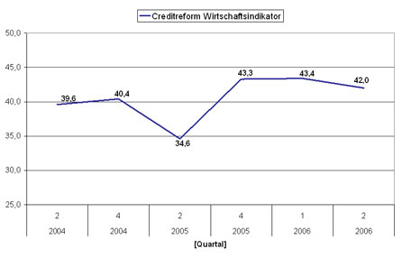 Der Creditreform Wirtschaftsindikator schwächt sich im zweiten Quartal 2006 leicht ab, bleibt aber mit einem Wert von 42,0 auf hohem Niveau. Der Rückgang geht auf eine leichte Verschlechterung des Geschäftsklimas, eine marginal erhöhte Insolvenzanfälligkeit sowie eine geringfügige Abnahme der Bonität zurück. Lediglich das Zahlungsverhalten ist besser geworden.