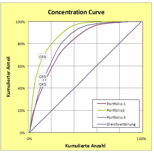 Die Concentration Ratio besitzt gleichwohl einige Schwächen. Sie berücksichtigt explizit nur die m Schwergewichte im Portfolio. Es lässt sich zwar vertreten, dass diese für die Abbildung der Konzentration entscheidend sind. Die Auswahl eines geeigneten m erfolgt jedoch in der Regel subjektiv. Nach Veränderungen der Portfoliostruktur, beispielsweise einer signifikanten Änderung der Anzahl der Elemente im Portfolio, kann sich das "optimale" m außerdem ändern. Wird dies berücksichtigt, resultiert im Zeitablauf wenig Kontinuität in der Darstellung im Reporting. Auch die Concentration Curve ist für die fortlaufende Risikosteuerung wenig zu gebrauchen: Sofern sich die Zusammensetzung eines Portfolios nicht wesentlich verändert, vermag nur ein geschärftes Adlerauge Veränderungen in der Kurve wahrzunehmen und zu interpretieren.