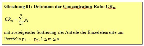 Relative Konzentrationsmaße stellen stärker auf die Zusammensetzung des Gesamtportfolios ab. Ein typischer Vertreter ist die Concentration Ratio CRm, welche den kumulierten Portfolioanteil der m Elemente mit den größten Anteilen am Portfolio misst (vgl. Gleichung 1).