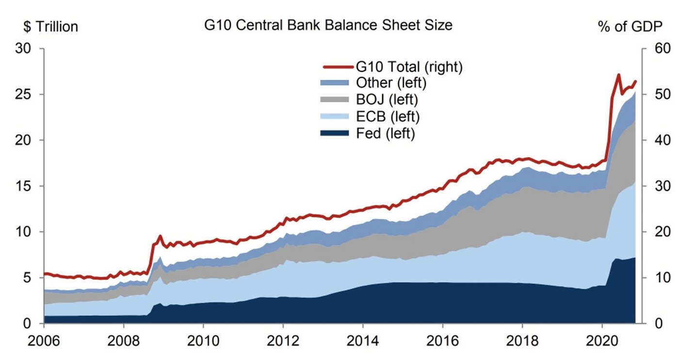 Im Falle von Bitcoin ist es die Blockchain-Technologie, die immense Potenziale hat, den Alltag zu revolutionieren. Insbesondere wird immer wieder darauf verwiesen, dass der Bitcoin qua definitionem limitiert ist – also in besonderem Maße für Preisstabilität sorgt - und nicht einfach von der Zentralbank "gedruckt" werden kann. Die folgende Grafik von Goldman Sachs zeigt die dramatische Entwicklung des "Quantitative Easing", bei dem Ende 2020 der Wert von 50% des G10-BIPs überschritten wurde: