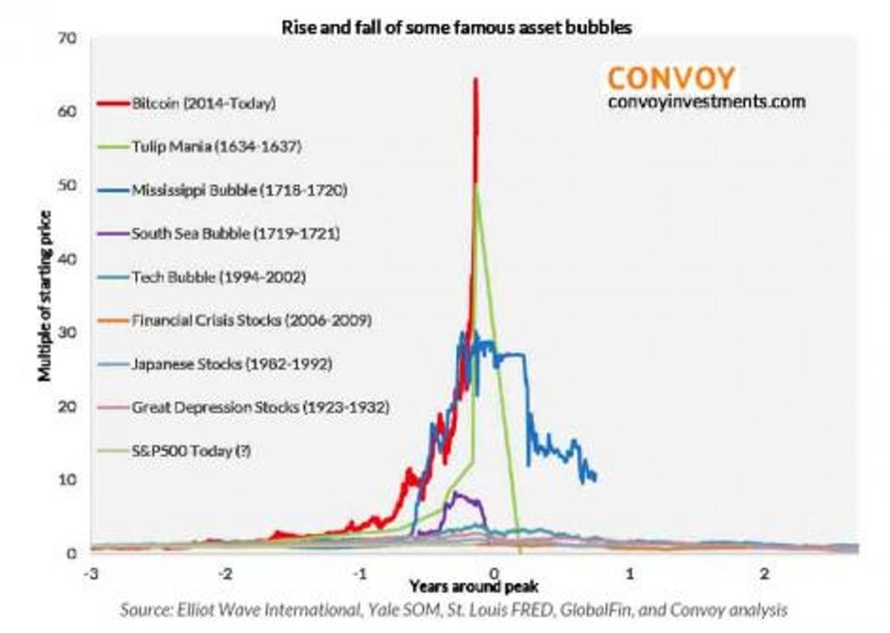 Bereits Ende 2017 wurde der Bitcoin als die "Größte Blase der Geschichte, noch vor der Tulpenmanie", bezeichnet. In einem Vergleich von damals wurde dies sehr anschaulich illustriert: