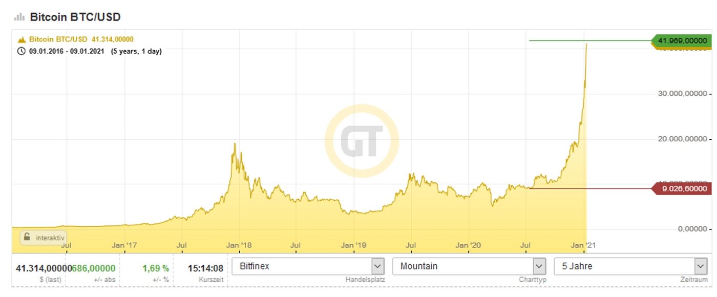 Kaum hatte der Bitcoin Anfang Januar diesen Jahres die Marke von 30.000 USD überschritten, setzte er eine Woche später zum Sprung über 40.000 USD an. Dies bedeutet eine Steigerung um 404% innerhalb eines Jahres und sagenhafte 8.850% innerhalb von 5 Jahren!