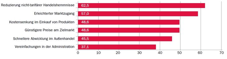 Neben den fiskalischen Aspekten spielt bei Freihandelsabkommen auch die Reduzierung der nicht-tarifären Handelshemmnisse eine große Rolle. Bei TTIP ist das nicht anders bzw. sogar recht ausgeprägt. So sehen die meisten Studienteilnehmer in den transatlantischen Verträgen eine Chance, um Handelshemmnisse abzubauen und den Marktzugang zu erleichtern (vgl. Abbildung 7). Ein möglicher Grund: Neuere Abkommen wie TTIP (oder auch CETA) betreffen hochentwickelte Märkte mit hohen Industriestandards, sodass vertragliche Angleichungen hierbei zu konkreten Vereinfachungen führen können. Je ausdifferenzierter und entwickelter die Märkte sind, desto größer ist der Vorteil einer Standardisierung bzw. Harmonisierung, so die Studienautoren.