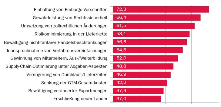 Und auch die Risikominimierung in der Lieferkette, die von Platz acht in der Vorjahresstudie auf Platz vier der diesjährigen Untersuchung geklettert ist, kann dem Themenkomplex zugeordnet werden. Die Ergebnisse sind vor dem Hintergrund der aktuellen Krisensituationen weltweit zu sehen. Insbesondere die Entwicklungen in Russland und der Ukraine beeinflussen das wahrgenommene Außenhandelsrisiko, so die Studienautoren. Die Unternehmen stehen derzeit vor der Herausforderung, ihre Prozesse an die sich häufig ändernden gesetzlichen Vorgaben anzupassen.
