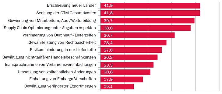Dies erklärt auch ein auf den ersten Blick erstaunliches Ergebnis der Studie: Kosteneinsparungen haben derzeit bei den Unternehmen im Global Trade Management keine so hohe Bedeutung. In der Rangliste der wichtigsten Themen sind die Supply-Chain-Optimierung unter Abgabenaspekten sowie die Senkung der GTM-Gesamtkosten über alle Unternehmen hinweg nur auf dem fünft- respektive drittletzten Platz zu finden.