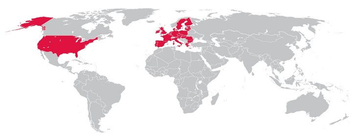 Abbildung 3: Grafische Darstellung der direkten Reichweite des TTIP-Abkommens (rote Länder)