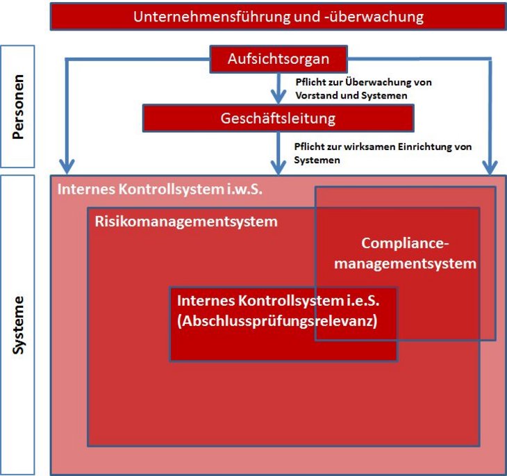 Das IKS besteht aus Regelungen zur Steuerung der Unternehmensaktivitäten (internes Steuerungssystem) und Maßnahmen zur Überwachung der Einhaltung dieser Regelungen (internes Überwachungssystem). Das interne Überwachungssystem beinhaltet prozessintegrierte (organisatorische Sicherungsmaßnahmen, Kontrollen) und prozessunabhängige Überwachungsmaßnahmen, die vor allem von der Internen Revision durchgeführt werden [vgl. IDW PS 261 n.F., Tz. 20].