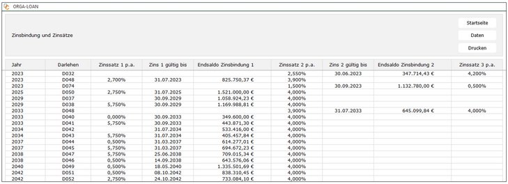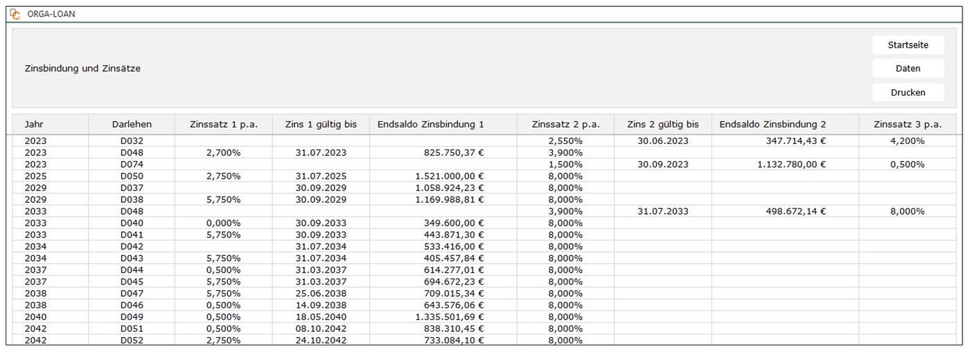 In folgendem Beispiel sind bei den 2023 aus der Zinsbindung fallenden Darlehen die neuen Zinskondition schon vertraglich fixiert. Ab 2025 werden hier nach Ablauf der jeweiligen Zinsbindungsfristen Prolongationszinssätze von einheitlich 4,0% unterstellt. Diese Zinsänderungen sind im Finanzplan bereits berücksichtigt (vgl. Abb. 01).