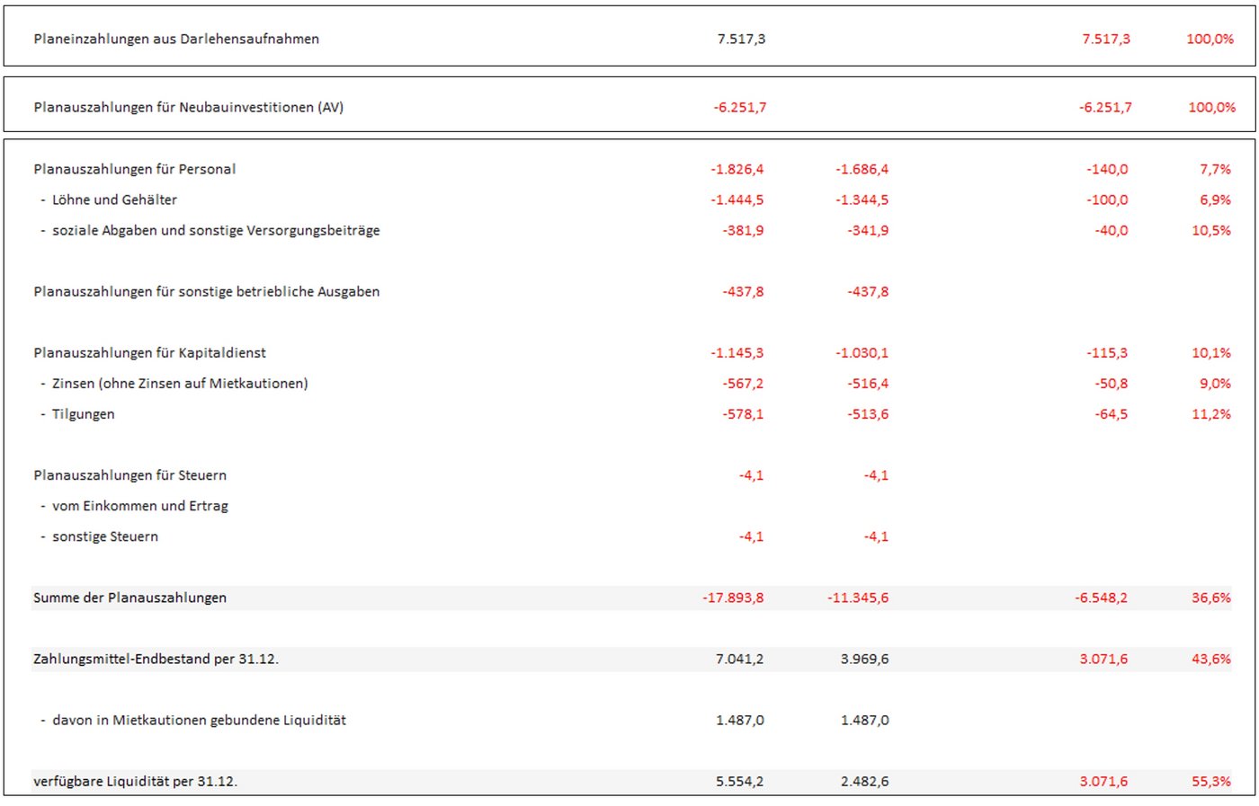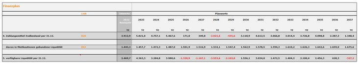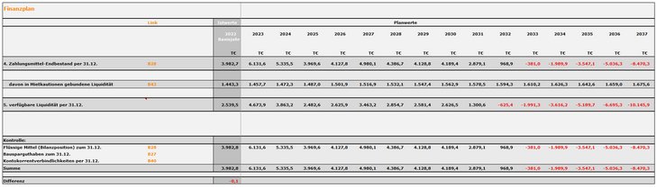 Der Finanzplan zeigt, dass hier tatsächlich eine bedrohliche Situation eintreten würde. In den Jahren 2026 bis 2029 könnte an eine vermehrte Fremdkapitalaufnahme gedacht werden bzw. an ein Verschieben der Neubau- und Modernisierungsmaßnahmen.
