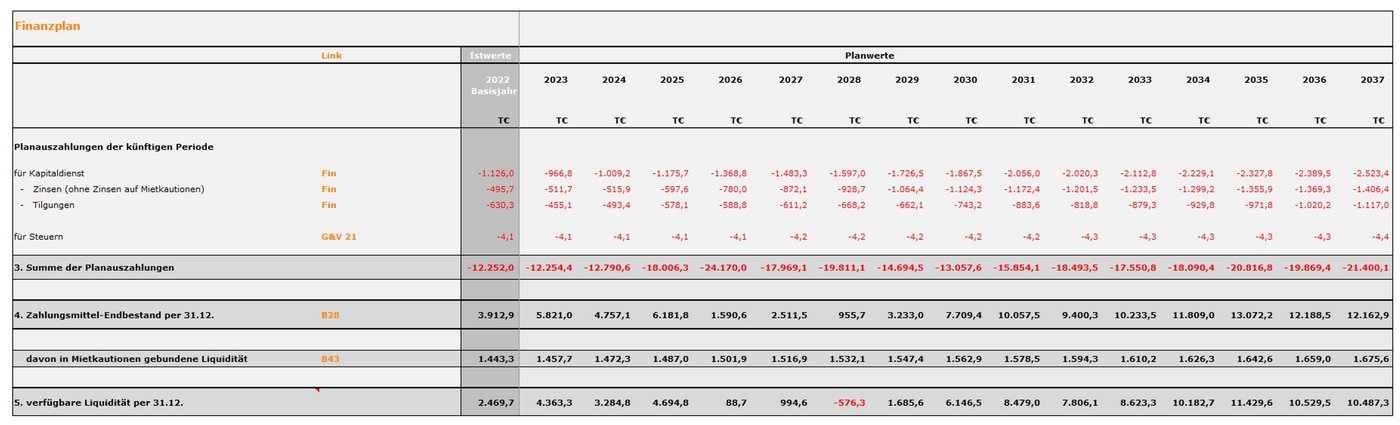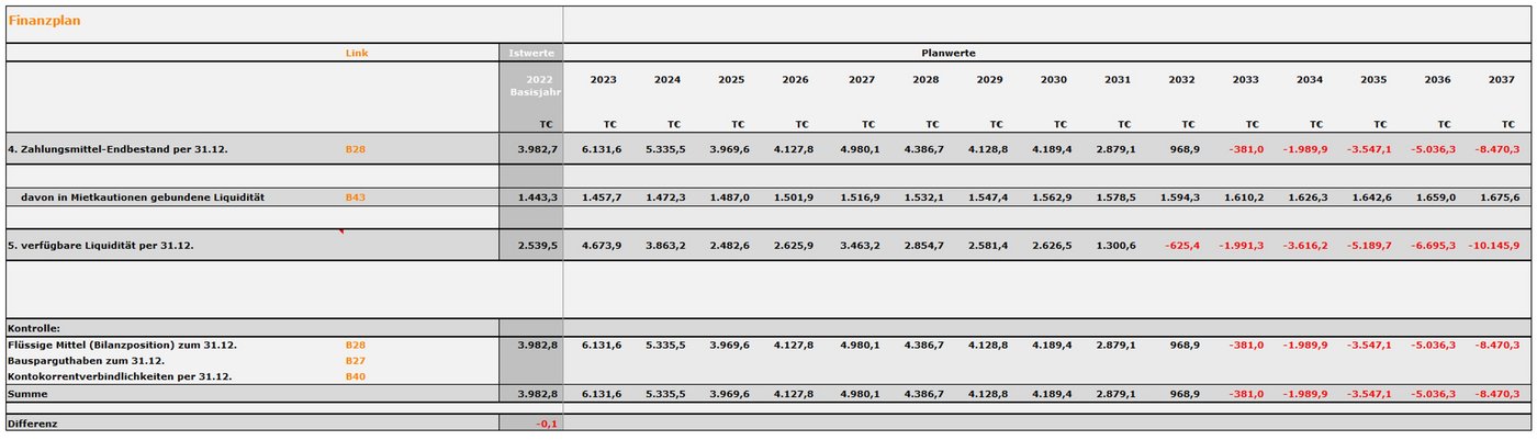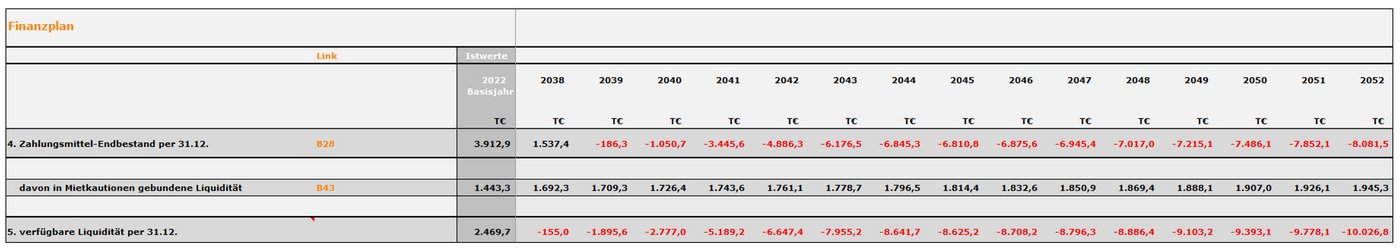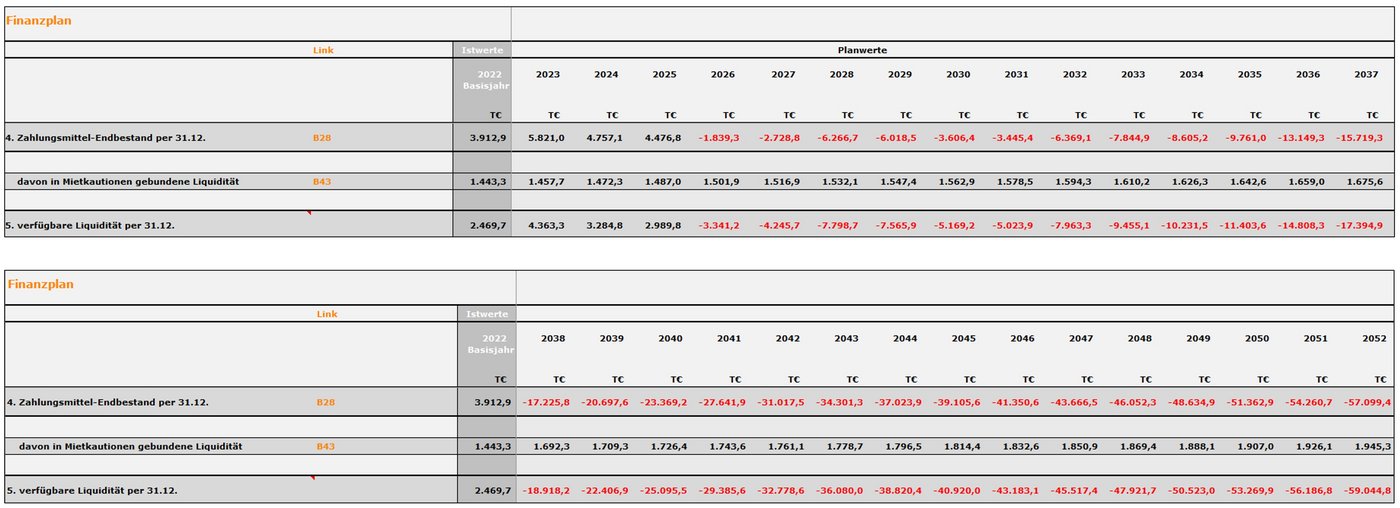 In der jahresübergreifenden Finanzplan-Betrachtung kann man sich nur mittelfristig auf der sicheren Seite wähnen, da bis 2031 keine Bestandsgefährdung des Unternehmens gegeben scheint. Verkaufserlöse aus schon begonnen Bauträgermaßnahmen kompensieren kurzfristig die jährlich sinkenden Ergebnisse, die ab 2032 zu Verlusten führen.