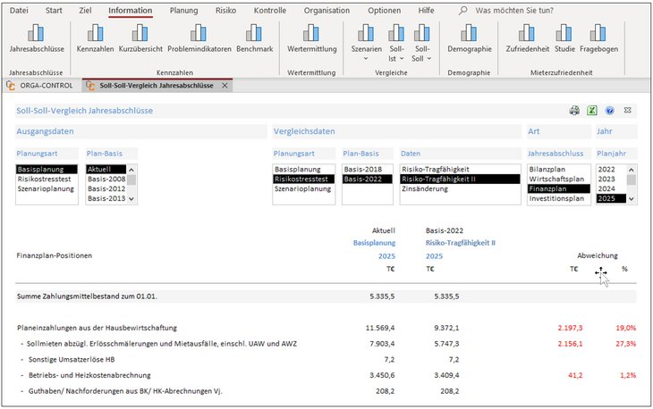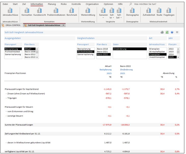 Der Soll-Soll-Vergleich der Finanzpläne verdeutlicht die Unterschiede für das ausgewählte Jahr 2025. Dabei geht die aktuelle Finanzplanung genauso vom Basisjahr 2022 aus, wie der StresstestRisiko-Tragfähigkeit II (Aktuell = Basis 2022).