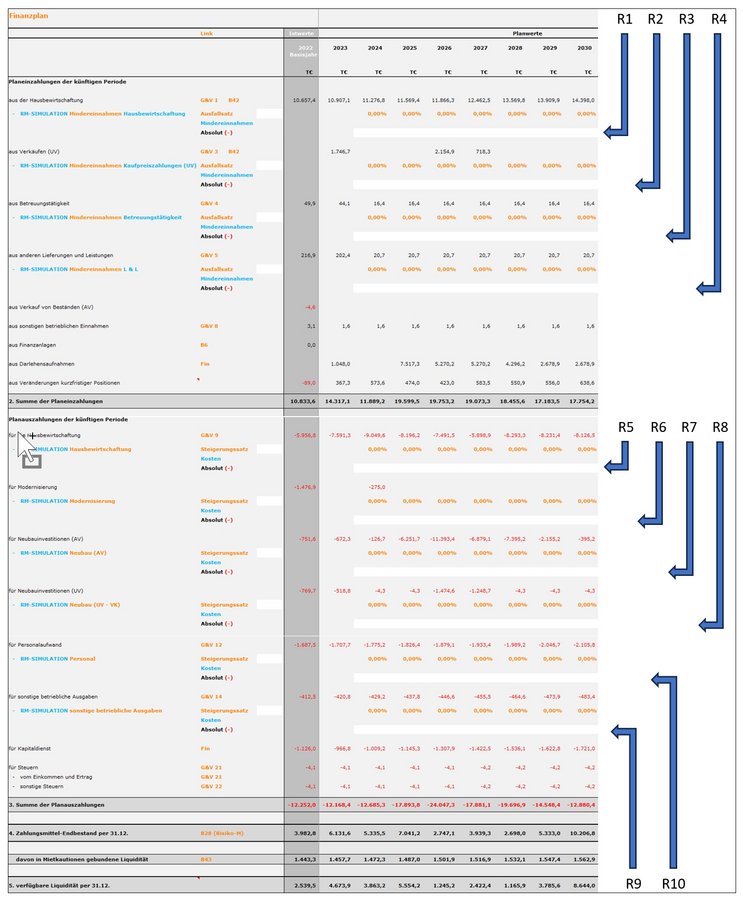 Risiken, die den Finanzbereich betreffen (Zinsänderungsrisiko etc.), werden daher besser via Darlehensrechner simuliert und damit in die Plan-G&V sowie den Finanzplan integriert.