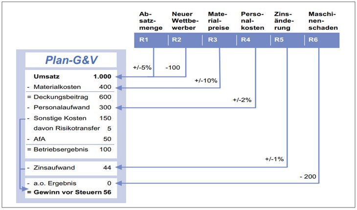Zur Darstellung der Risikotragfähigkeit bei Risikoaggregation - sprich bei der Kombination von Risiken - schlägt Gleißner die Integration der Risiken (hier z.B. R1 bis R6) in den Wirtschaftsplan (Plan-G&V) vor (vgl. Gleißner, Werner 2017: Risikoanalyse, Risikoquantifizierung und Risikoaggregation. In: WiSt, 46. Jg. (2017), Heft 9, S. 4 – 11, hier S. 10.).