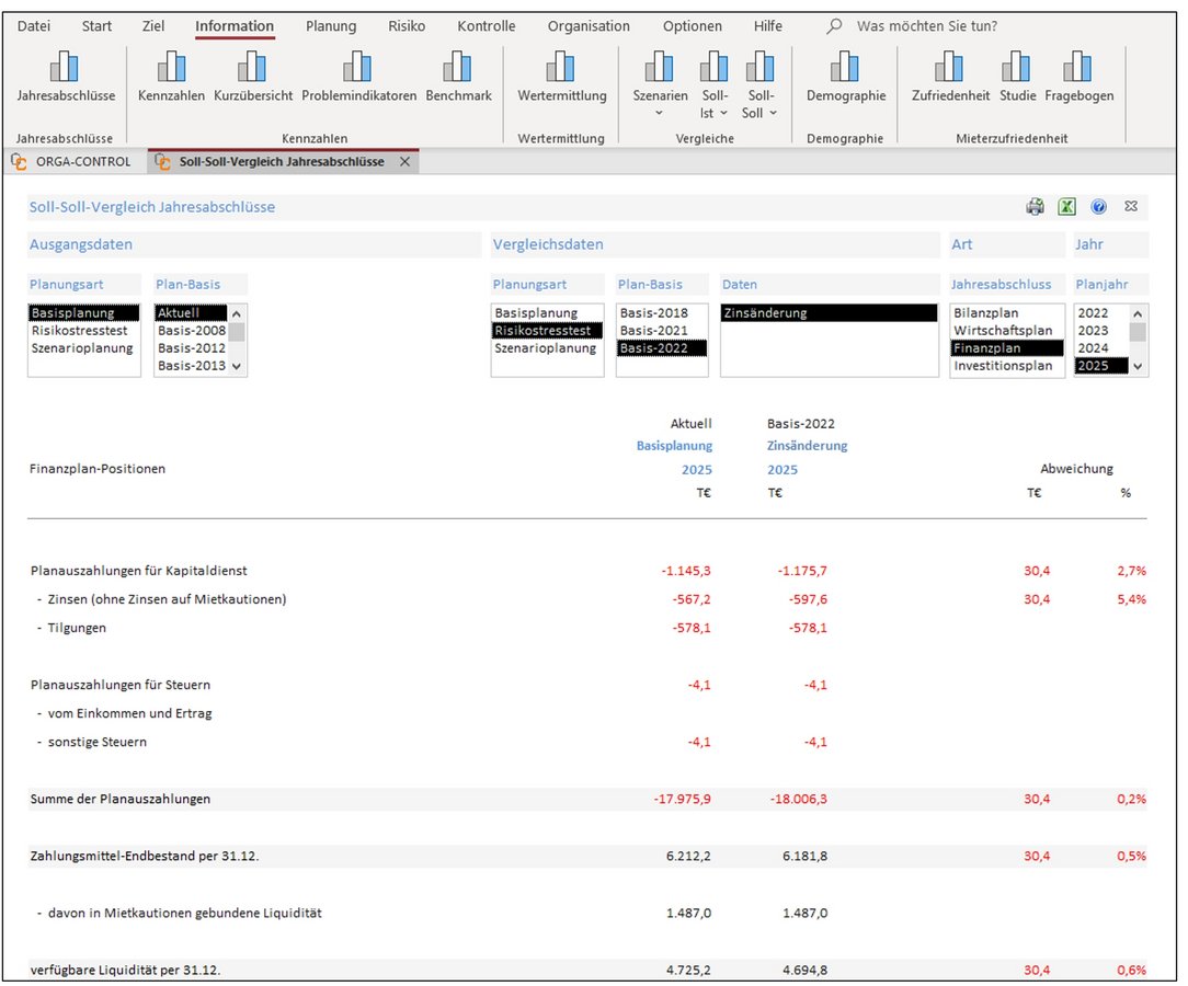 Der Darlehensrechner ist neben dem Finanzplan als weiteres wichtiges Controlling-Instrument zu nennen. Auch er fungiert gleichzeitig als Frühaufklärungssystem. Über den Darlehensrechner berücksichtigt bereits die Basis-Planung nicht nur zukünftige Plan-Darlehen, sondern auch zukünftige Zinsänderungen.