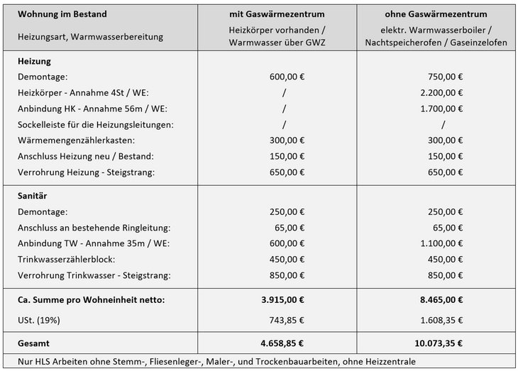 Die projektierende Ingenieursgesellschaft schätzte auf Basis dieser Kostenberechnungen die Anschlusskosten in den anderen Wohnanlagen für Wohnungen mit und ohne Heizkörper.