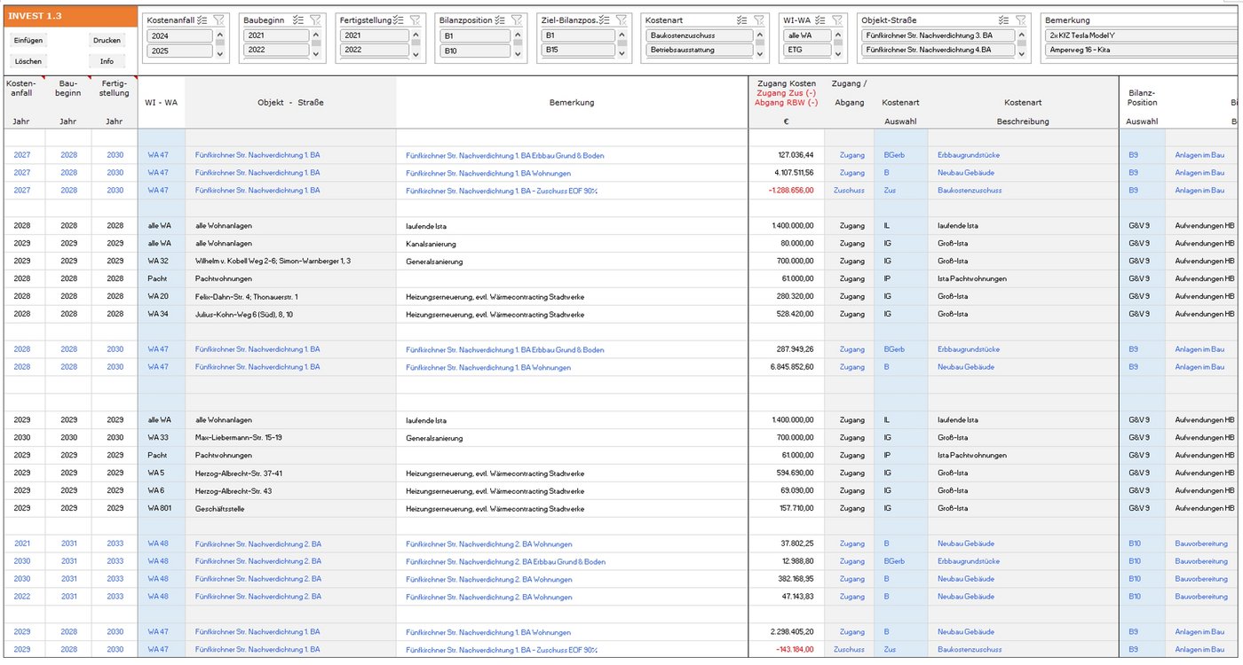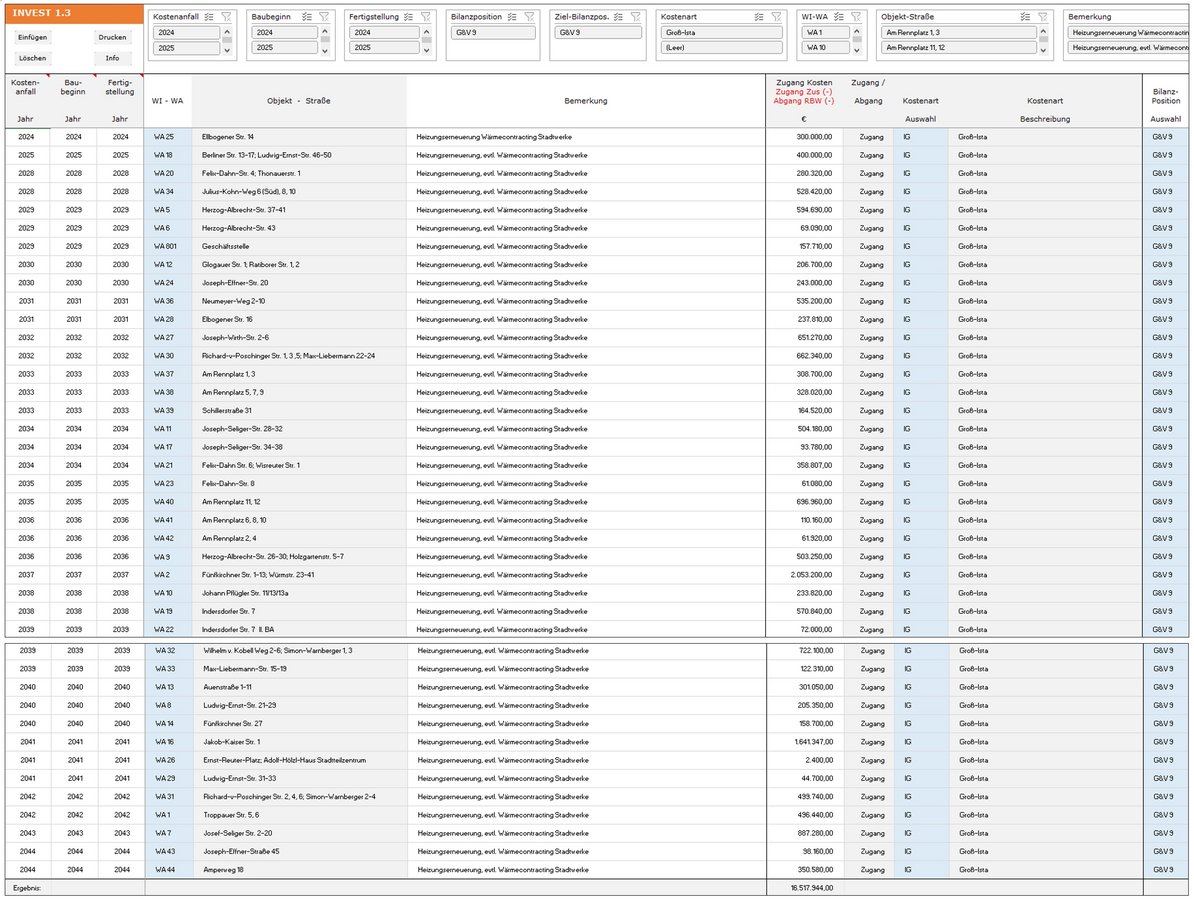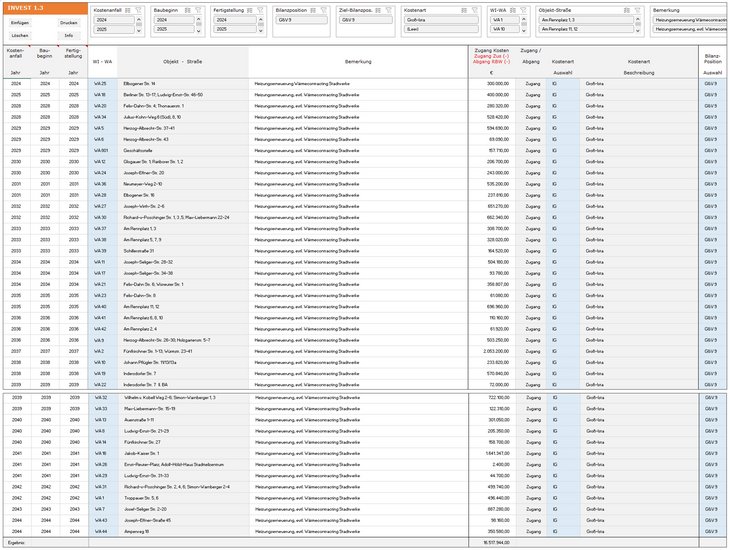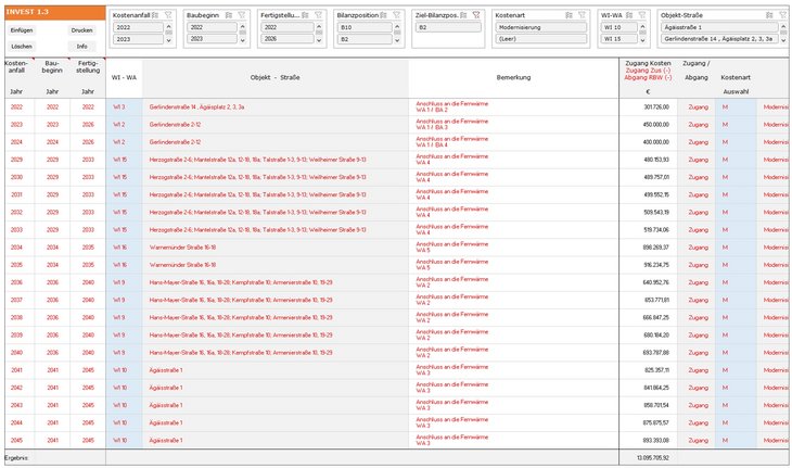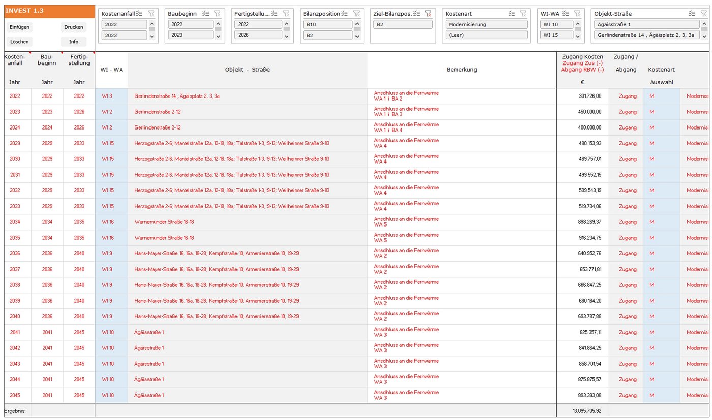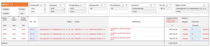 Zusammen mit den anderen geplanten Investitionsmaßnahmen und den damit in Verbindung stehenden Afa-Perioden, Bestandsdatenänderungen (Wohnungen, Gewerbeeinheiten, Flächen), Mietänderungen sowie BK / HK – Änderungen fließen die Daten des INVEST-Tools in die Basis-Planung ein.