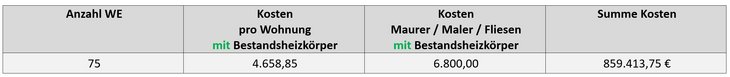 Bei den Heizkörpern wurden 900,00 € pro Stück unterstellt, die Kostenermittlung für Wärmepumpen ergab 1.900,00 € pro KW, die Summe aus beiden wurde mit 20% Planungskosten beaufschlagt sowie ein hydraulischer Abgleich mit 300,00 € pro Wohnung hinzuaddiert.
