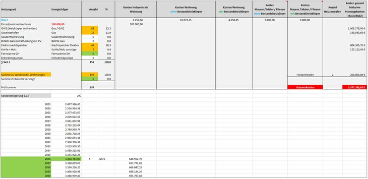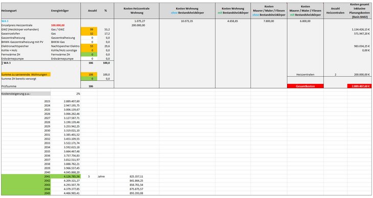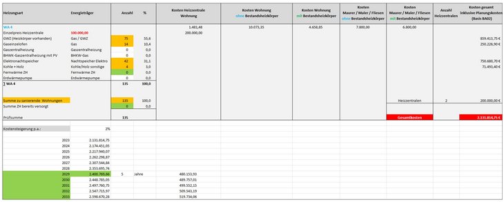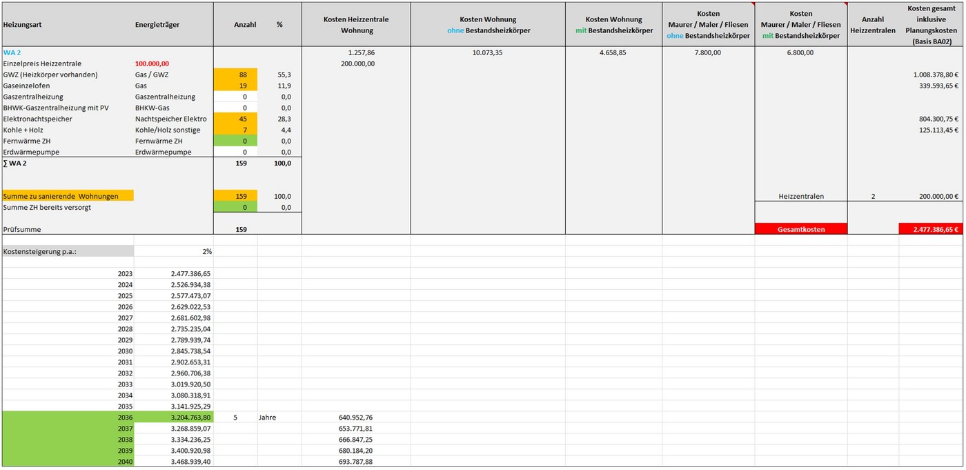 Mit den zwei Heizzentralen addieren sich die Kosten auf 2.131.814,75 €, die mit jährlich 2,0% Preissteigerungsrate bis zum geplanten Realisierungszeitpunkt beaufschlagt werden.