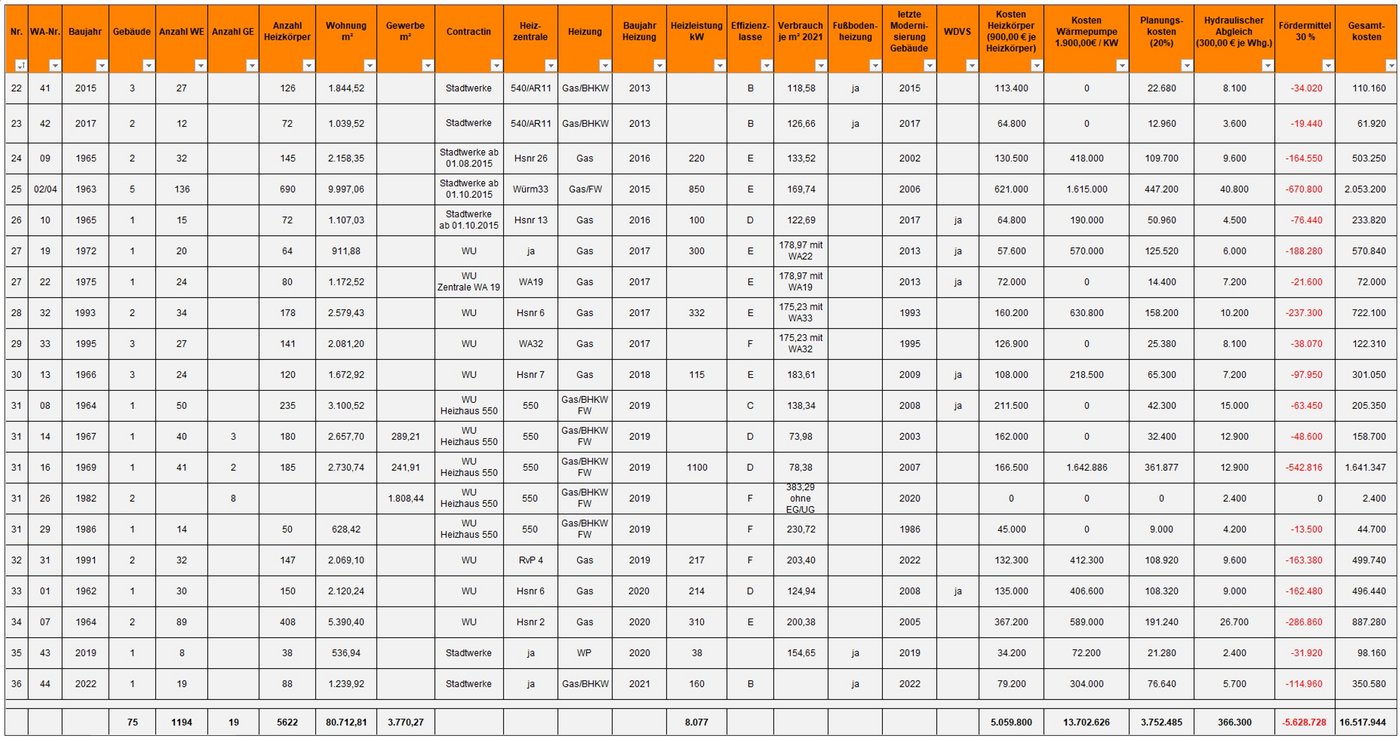Die Stadtbau Dachau GmbH hat zunächst pro Wohnanlage über die Anzahl der Wohnungen die Anzahl der Heizkörper ermittelt. Neben der m²-Wohnfläche sind die Heizungsart, deren Effizienzklasse sowie die aktuellen Verbräuche je m² dokumentiert. In Zusammenarbeit mit einem Heizungsprojektanten erfolgte dann die Kostenschätzung für Wärmepumpen im Geschosswohnungsbau auf Basis der KW Heizleistung.