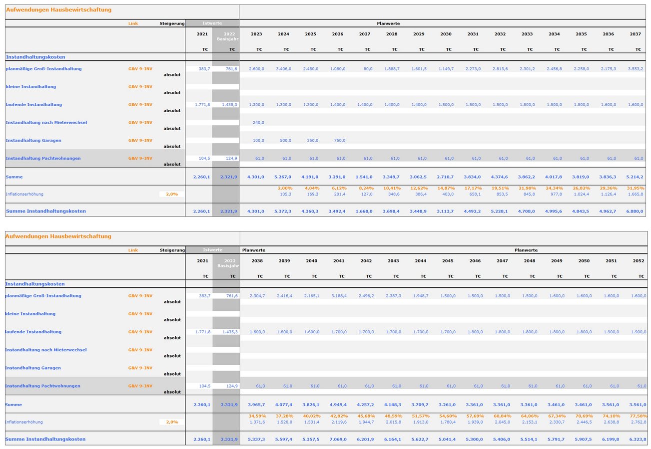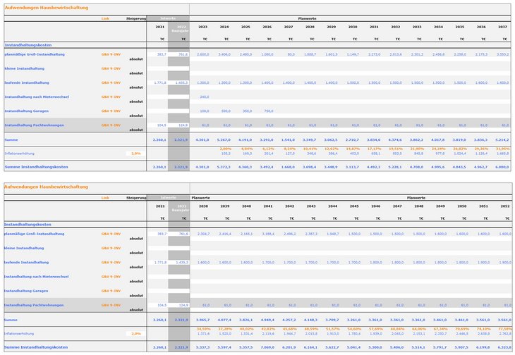 Oben genannte Kosten wurden als Instandhaltungskosten deklariert, in der Basis-Planung finden sie deshalb innerhalb der Position Aufwendungen für Hausbewirtschaftung in Form von Groß-Instandhaltungskosten Berücksichtigung.