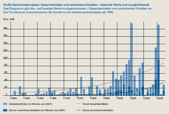 Lag doch die Zahl im Jahr 1950 noch bei durchschnittlich drei Katastrophen jährlich, so überschreiten wir derzeit die Trendmarke von zehn großen Naturkatastrophen pro Jahr. Neben der Häufigkeit steigt auch stetig das Ausmaß der großen Naturkatastrophen. Un der Trend ist eindeutig: Die Berechnungen der Münchener Rück zeigen aktuelle einen jährlichen Gesamtschaden von derzeit 70 Mrd. US-Dollar. Von den Gesamtschäden sind jedoch nur etwa 50 Prozent tatsächlich versichert (vgl. Abbildung). Als Gründe für diese alarmierende Entwicklung sieht Peter Höppe die zunehmende Bevölkerungszahl und deren Konzentration auf Ballungsgebiete, verbunden mit deren steigenden Lebensstandard, die Auswirkungen auf die sich verändernden Umweltbedingungen haben. So ist allein in den letzten dreißig Jahren die Jahresdurchschnittstemperatur vom Mittelwert jährlich ca. um 0,5°C gestiegen. Dies zeigt auch eine Erhebung der "Climate Research Unit" (UK) aus diesem Jahr, wonach die zehn wärmsten Jahre, seit der Wetteraufzeichnung, innerhalb der letzten elf Jahre lagen. Als Hauptursache für die extremen Wetterbedingungen sieht Peter Höppe, auch Mitglied des Klimarates der Bayrischen Staatsregierung, die stetig steigende CO2–Konzentration in der Erdatmosphäre, sowie die signifikant erhöhte Oberflächentemperatur der Weltmeere, die Grundlage für die vermehrte Entstehung von Stürmen ist.