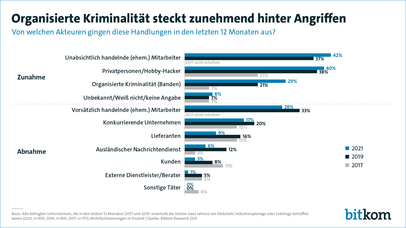 Ein Blick auf die Beteiligten, von denen die schädigenden Handlungen ausgehen (Mehrfachnennungen möglich) zeigt: In 61 Prozent der von Diebstahl, Spionage und Sabotage betroffenen Unternehmen wurden Schäden durch Mitarbeiterinnen und Mitarbeiter verursacht, teils auch nachdem sie bereits aus dem betroffenen Unternehmen ausgeschieden waren. 42 Prozent der betroffenen Unternehmen berichten von Mitarbeiterinnen und Mitarbeitern, die unabsichtlich gehandelt haben. 28 Prozent der Unternehmen gehen dagegen davon aus, dass Schäden vorsätzlich herbeigeführt wurden. Eine unzureichend geschulte oder unaufmerksame Belegschaft und Innentäter bleiben damit ein zentrales Problem für die deutsche Wirtschaft. Viele Angriffe kommen aber von außen, beispielsweise von Privatpersonen bzw. Hobby-Hackern (40 Prozent). Der stärkste Zuwachs im Vergleich zu den Vorjahren ist allerdings der organisierten Kriminalität zuzurechnen: In den Jahren 2016/2017 führten 7 Prozent der betroffenen Unternehmen Attacken auf organisierte Kriminalität zurück, 2018/2019 bereits 21 Prozent. 2020/2021 ist der Wert nun auf 29 Prozent gestiegen.