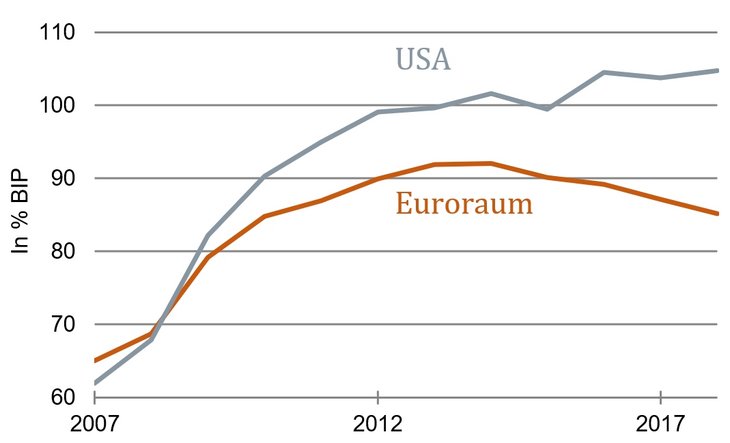 Voraussetzung ist natürlich, dass der Staat nicht gleichzeitig hohe Budgetdefizite "fährt" und damit den positiven Effekt auf die Verschuldung konterkariert. Das ist der Pferdefuß an den dargestellten Zusammenhängen (der in der Theorie leider nicht erwähnt wird). Er ist beispielsweise in den USA zu beobachten, wo die Steuern 2018 massiv gesenkt wurden. Die Verschuldung hat sich deshalb nicht ermäßigt, sondern im Gegenteil weiter erhöht, wenn auch in geringerem Tempo (Grafik). Auch in Ländern Europas droht diese Gefahr.