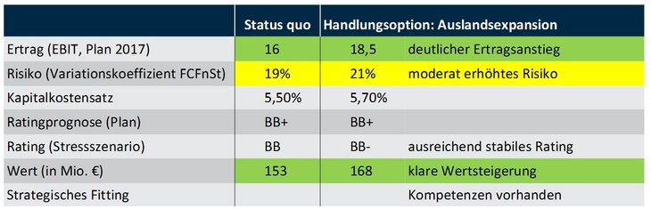 Abb. 04 zeigt beispielhaft die Management Summary einer Entscheidungsvorlage (zu einer Strategie der Auslandsexpansion). Man sieht, dass die durch die mögliche Auslandsexpansion zu erwartende Änderung des Risikoumfangs – sowie deren Implikation für Kapitalkosten und den Wert als Erfolgsmaßstab – angegeben ist.