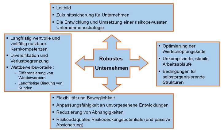 Das Ziel sollte daher ein "Robustes Unternehmen" [Vgl. zu diesem strategischen Konzept Gleißner 2000b, Gleißner 2004b und Gleißner 2008] sein, das so flexibel und beweglich ist, sich auch an unvorhergesehene Entwicklungen anpassen zu können. Seine (messbaren) Risiken durch unsichere Marktentwicklungen sind beispielsweise so abzustimmen, dass sie vom "Sicherheitspuffer" Eigenkapital und Liquidität (Risikodeckungspotenzial) getragen werden können und ein angemessenes Rating gesichert ist, auch wenn schwerwiegende Risiken eintreten. Ein "Robustes Unternehmen" konzentriert sich auf Kernkompetenzen, die langfristig wertvoll, schwierig kopierbar und vielfältig nutzbar sind. Es baut auf dieser Grundlage – orientiert an den Kundenwünschen – Wettbewerbsvorteile auf, die zu einer Differenzierung von Wettbewerbern und zur langfristigen Bindung von Kunden beitragen. Dies führt zu "Preissetzungsmacht" und der Möglichkeit, Kostenschwankungen zu überwälzen. Unattraktive Tätigkeitsfelder oder Kundengruppen werden gemieden. Infolge intensiven Wettbewerbs und sinkender Transaktionskosten ist die Wertschöpfungskette dahingehend optimiert, dass nur Aktivitäten im Unternehmen erbracht werden, die nicht besser zugekauft werden können, und durch deren Auslagerung das Unternehmen nicht zu sehr in Abhängigkeit gerät. Das Unternehmen gestaltet seine Arbeitsabläufe möglichst unkompliziert unter gleichzeitiger Berücksichtigung von Kosten-, Risiko-, Geschwindigkeits- und Qualitätsaspekten. Es wird, soweit möglich, Bedingungen für selbstorganisierende Strukturen geschaffen, die den Mitarbeitern Freiräume und Anreize für eigenverantwortliches Handeln bieten.