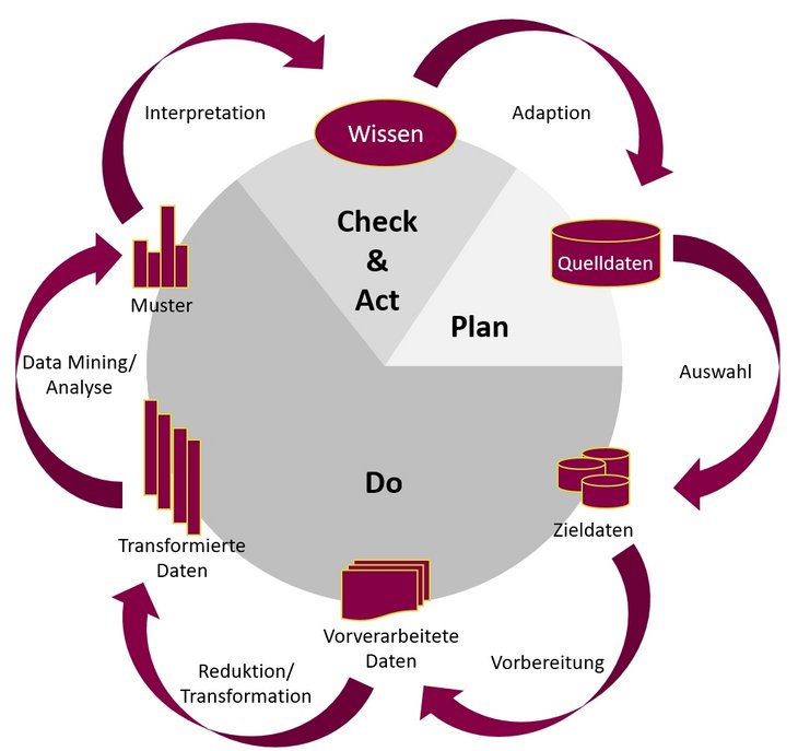 Der KDD-Prozess, welcher aus fünf Schritten und damit verbundenen Inputs und Outputs besteht, lässt sich in der Praxis, wie in Tab. 01 dargestellt, an dem Standard-PDCA-Modell optimieren.