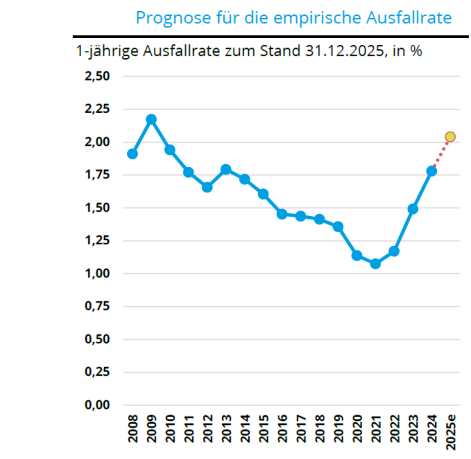 Die Grafik illustriert eindrücklich den Wendepunkt im Ausfallgeschehen. Während die Jahre 2015 bis 2020 durch historisch niedrige Quoten (teils unter 1,0 Prozent) gekennzeichnet waren, zeigt sich seit 2021 eine durchgehende Aufwärtsbewegung. Der Wegfall pandemiebedingter Stützungsmaßnahmen und gleichzeitige externe Schocks wie geopolitische Spannungen, steigende Energiepreise und Zinsanhebungen haben die Resilienz vieler Unternehmen erschüttert.