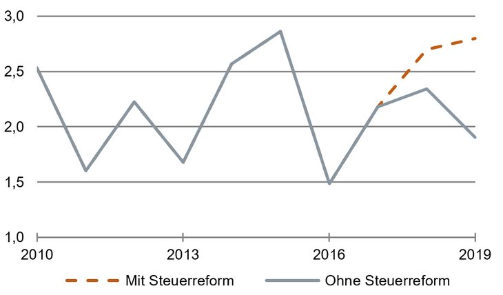 US-Wachstum mit und ohne Steuerreform [yoy in %; Quelle: IMF, eigene Schätzung]