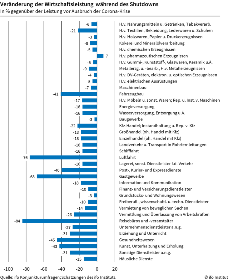 Den größten Einbruch der Geschäfte im April meldeten Reisebüros und -veranstalter (minus 84 Prozent), die Luftfahrtbranche (minus 76 Prozent), das Gastgewerbe (minus 68 Prozent), das Gesundheitswesen (minus 45 Prozent), Kunst, Unterhaltung und Erholung (minus 43 Prozent) sowie der Fahrzeugbau (minus 41 Prozent). Einziger Gewinner der Corona-Krise war die Pharma-Industrie mit einem Anstieg der Auslastung um 7 Prozent.
