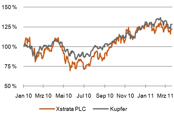 Wenn die Gewinnerzielung des Unternehmens maßgeblich durch die Preisentwicklung eines Rohstoffes bestimmt wird, wäre alles andere als eine immens hohe Korrelation zwischen dem Aktienkurs sowie dem Rohstoff auch überraschend. Diese Analyse lässt sich allerdings auf nahezu alle Unternehmen anwenden, auch wenn der Zusammenhang zwischen der Gewinnerzielung des Unternehmens und einigen zugrunde liegenden Märkten etwas komplexer sein kann. Die nachfolgende Abbildung 1 stellt den Zusammenhang zwischen einer Kupferminenaktie und dem Kupferpreis dar.![Abbildung 1: Was ist was? Kupferpreis gegen den Xstrata-Aktienkurs [Quelle: Bloomberg] Abbildung 1: Was ist was? Kupferpreis gegen den Xstrata-Aktienkurs [Quelle: Bloomberg]](/fileadmin/template_risknet/images_content/Abb-01-Felsenheimer-2011-03.jpg)