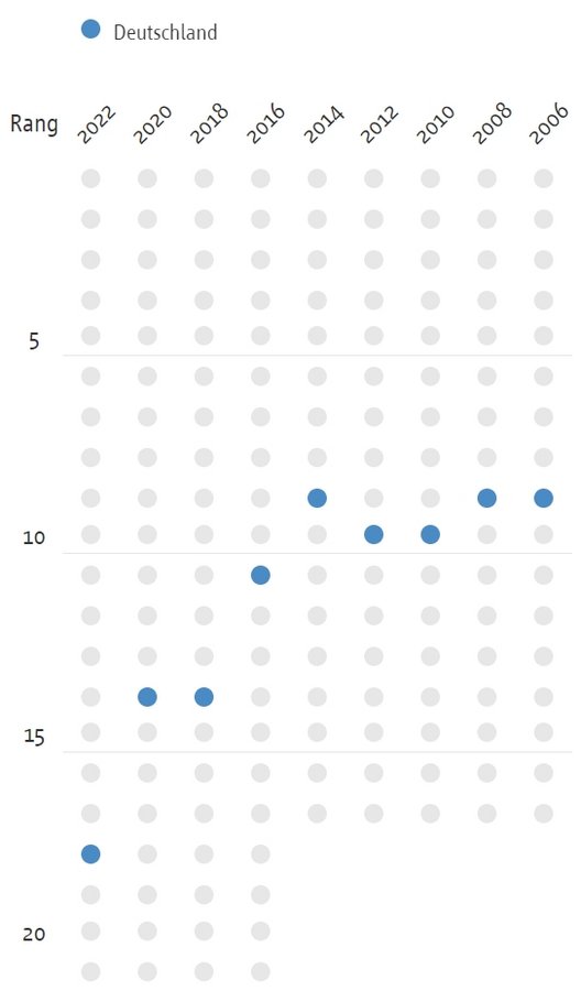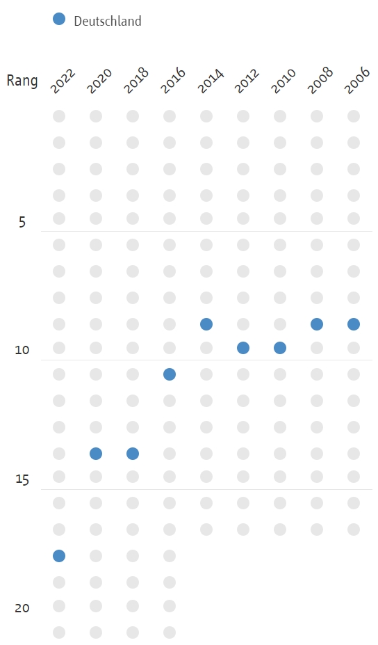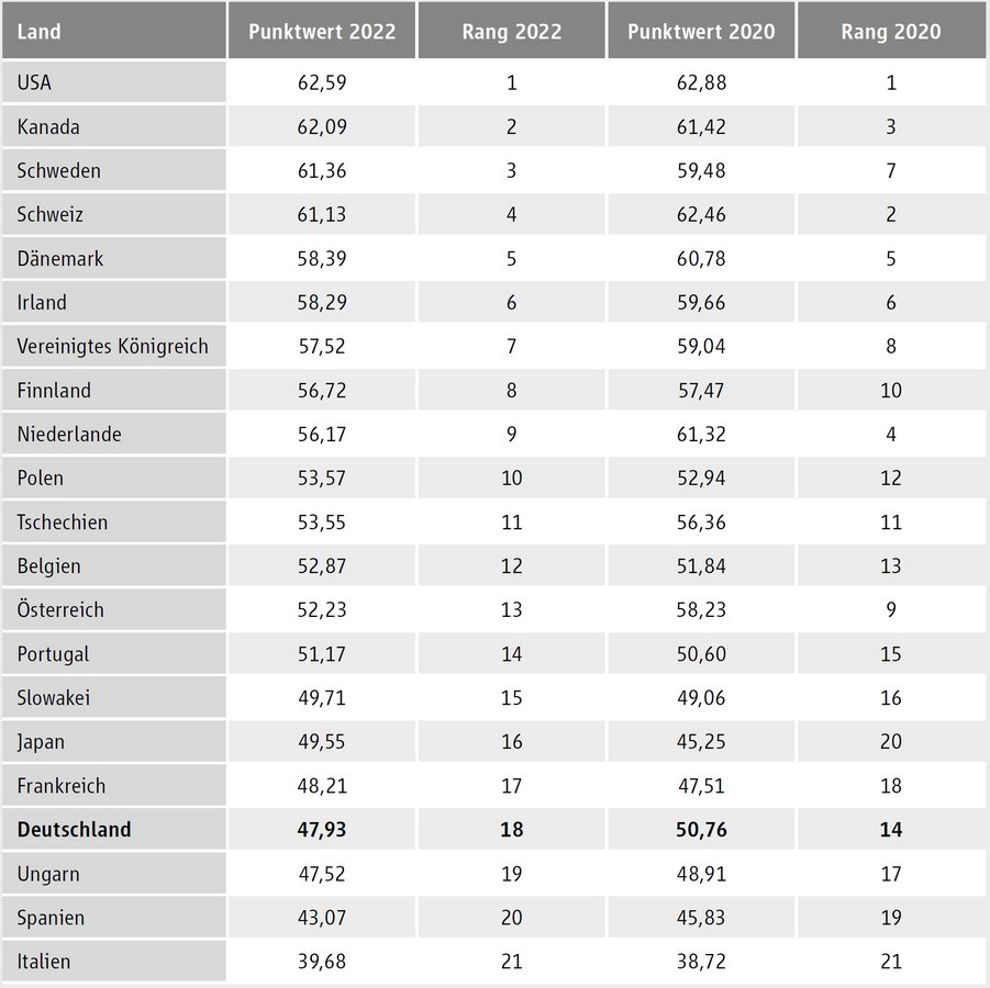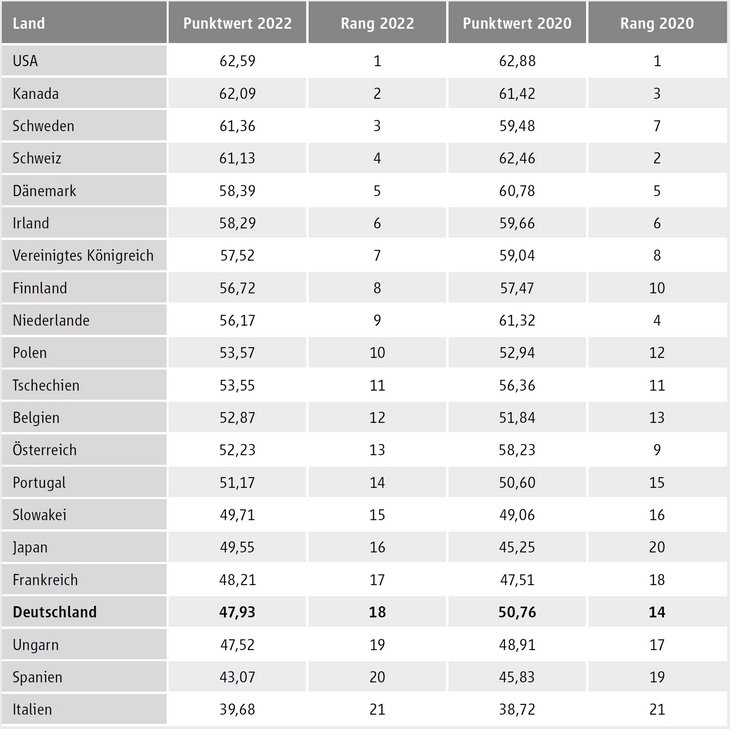 In der aktuellen Rangliste befindet sich Deutschland auf Platz 18, vier Plätze schlechter als beim vorhergehenden Länderindex aus dem Jahr 2020. Allerdings liegen die Länder auf den Plätzen 14 bis 19 mit ihren Punktwerten sehr nah beieinander. Es gibt für Deutschland aber keinerlei Anzeichen für eine Aufwärtsbewegung. Nur Ungarn, Spanien und Italien schneiden noch schlechter ab.