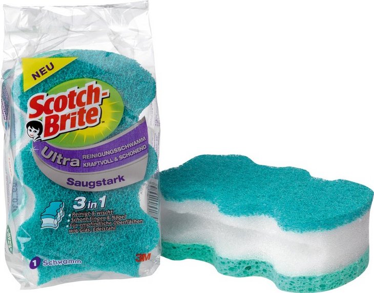 Innovationen müssen nicht spektakulär sein, sondern einen sinnvollen Nutzen stiften, wie der praktische "3 in 1 Schwamm" von ScotchBrite: Die neuen Ultra-Schwämme reinigen, trocknen und schonen in einem und liegen dank einem ergonomischen Design gut in der Hand. [Bildquelle: ScotchBrite]