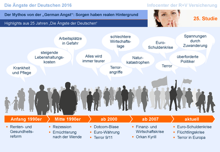 Wie der Rückblick auf 25 Jahre zeigt, haben die Sorgen der Bundesbürger durchaus einen realen Hintergrund. Anfang der neunziger Jahre dominierten Ängste vor Krankheit und Pflegefall. Damals begannen die öffentlichen Diskussionen über die Renten- und Gesundheitsform. Zudem rückte erstmals das Thema demografischer Wandel in den Fokus.