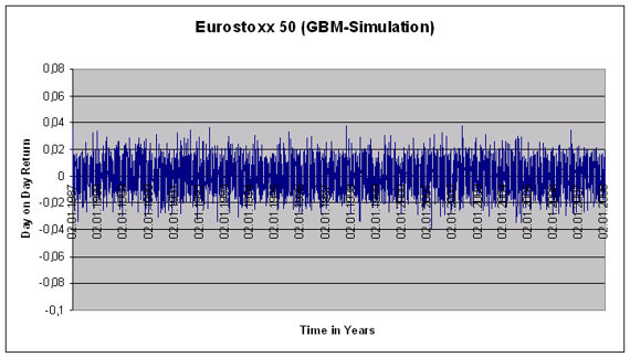 Abb. 1: Eurostoxx simuliert basierend auf einem GBM-Modell (1987 bis 2008), © RiskNET GmbH
