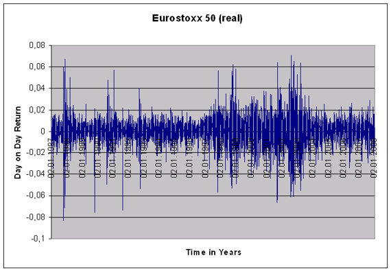Kurzum: Wer sich auf die Normalverteilung und Modelle der geometrischen Brownschen Bewegung verlässt, blendet Risiken systematisch aus und wird irgendwann von der Realität an den Finanzmärkten überholt. Die nachfolgenden Abbildungen skizzieren den Verlauf des Eurostoxx im Zeitraum 1987 bis 2008.