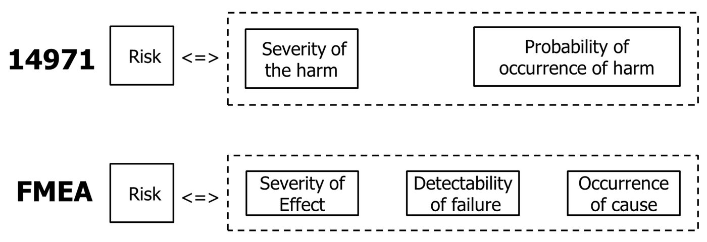 Risiko aus Sicht der FMEA fokussiert hingegen den Fehler des Medizinprodukts selbst, indem das Auftreten der Ursache und die Entdeckung desselben oder dessen Folgen nach Bewertungs-Tabellenvorgabe abgeschätzt wird.