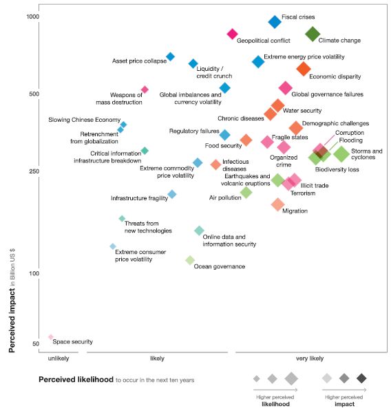 Auf Grund des rasanten Bevölkerungswachstums, gegenüber dem Jahr 1970 mit 3,69 Mrd. Menschen hat sich mit aktuell knapp 6,94 Mrd. Menschen die Zahl fast verdoppelt, wird die Versorgung mit Wasser, Nahrungsmittel und Energie zukünftig immer schwerer zu bewältigen sein. Hierzu sind vorausschauende Investitionen in die Infrastruktur notwendig, die jedoch nach der Finanzmarktkrise noch schwerer zu finanzieren sind als zuvor. Geopolitische Verteilungskämpfe sind vorprogrammiert und das Risiko ist nach der Expertenschätzung sehr wahrscheinlich.