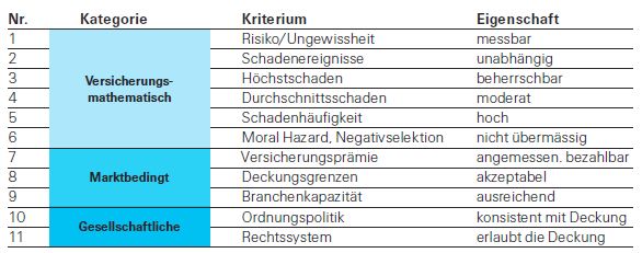 Tabelle: Voraussetzungen der Versicherbarkeit (Quelle: Baruch Berliner: Limits of Insurability of Risks, 1982; Sigma 03/2011)